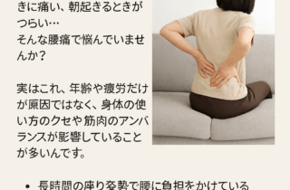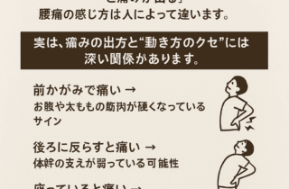 一時的な痛みの軽減ではなく、“動きそのもの”を見直すことで、日常生活での快適さと、痛みが起こりにくい身体づくりをサポートします。